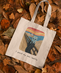 This surreal, glitch-framed design reinterprets a classic expressionist scene through a modern, distorted lens. The warped borders and fragmented colors amplify the message: