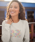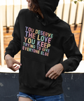 Featuring bold, block-style typography in soft pastel tones against a black background, this statement delivers warmth with clarity. The message is direct yet deeply compassionate—reminding the wearer that love should not only be given endlessly, but also received, protected, and claimed.