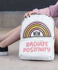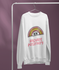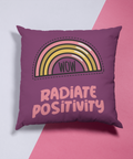 This design features a clean, modern rainbow in soft pink and warm yellow tones, paired with the uplifting phrase “Radiate Positivity.” The glossy highlights on the rainbow add a subtle shine, while the hand-drawn style typography keeps the message friendly, warm, and approachable.