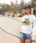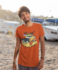 Featuring a retro-style surf van parked on warm sand with a surfboard standing tall against a bold sunset, this design captures the soul of endless summers and slow living. The hand-drawn illustration style blends vintage surf culture with modern graphic clarity, while the warm yellows, deep blues, and fiery accents create a striking contrast on dark backgrounds.