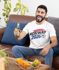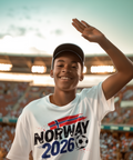 This statement-style DTF transfer features “2026” combined with bold red, white, and blue paint-stroke elements inspired by the Norwegian flag, paired with a dynamic football graphic. The energetic brush-stroke composition adds motion and impact while clearly representing Norway’s national identity and football spirit.