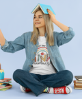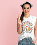 Featuring the word โ€œTINYโ€ built from playful school-inspired elements like rulers, pencils, textures, and bold color blocks, topped with a cheerful rainbow and apple, this design captures the joy and energy of teaching little minds.