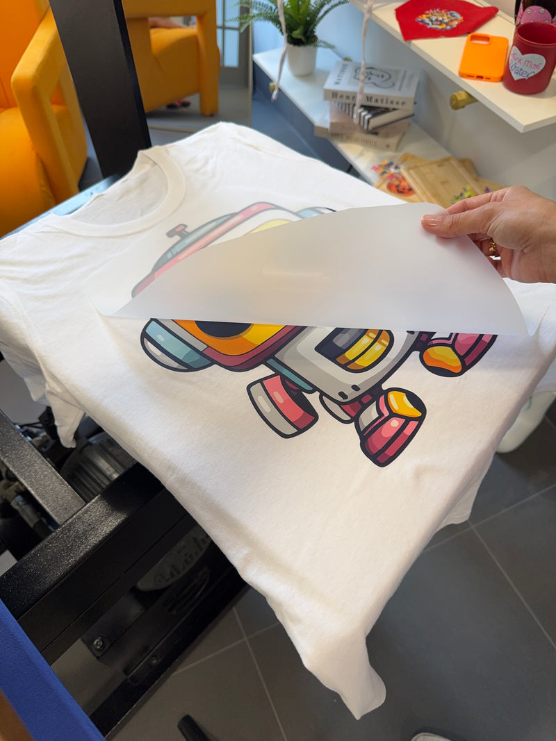 Carefully peel the DTF Transfer Sheet off while it is still warm in one smooth motion.